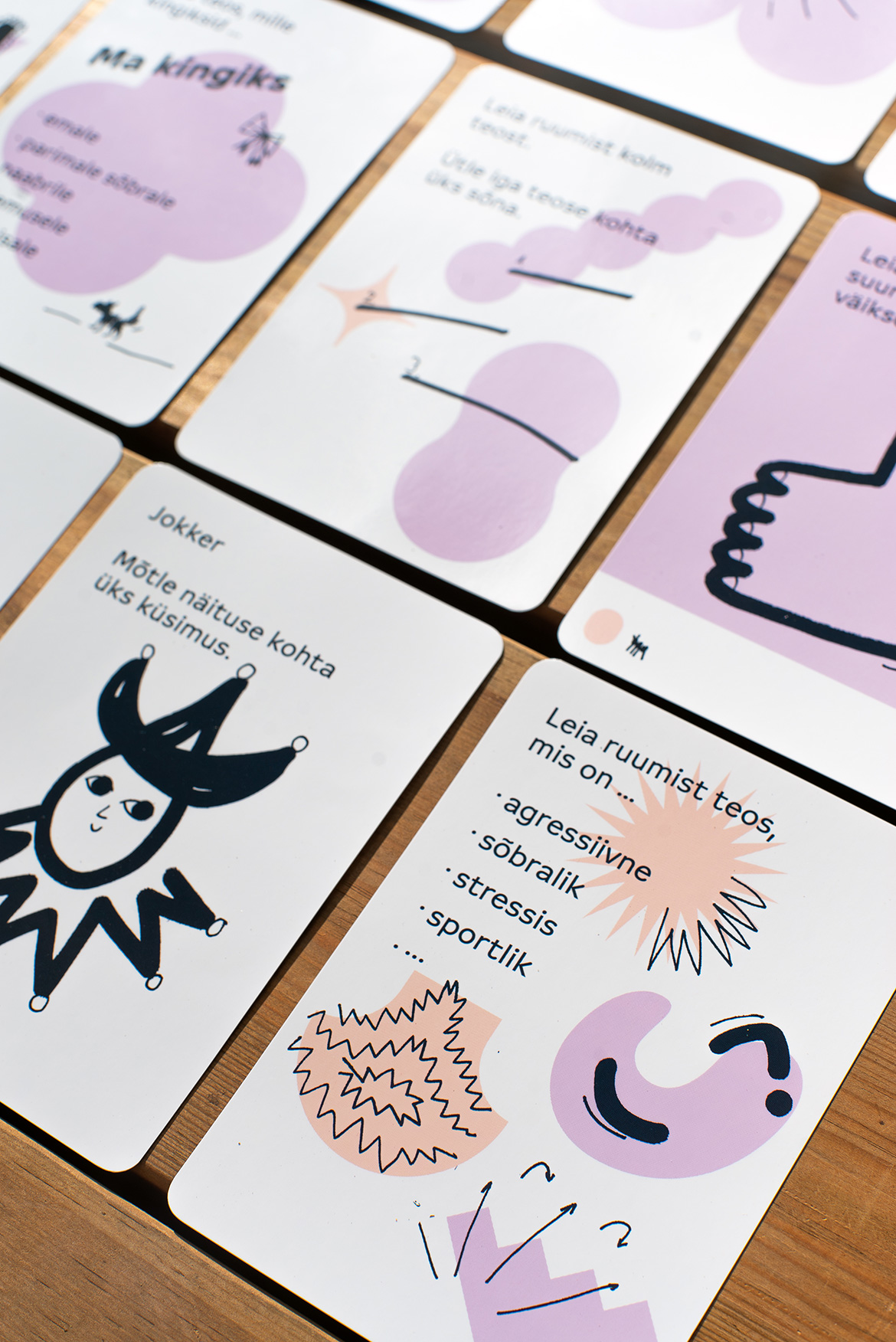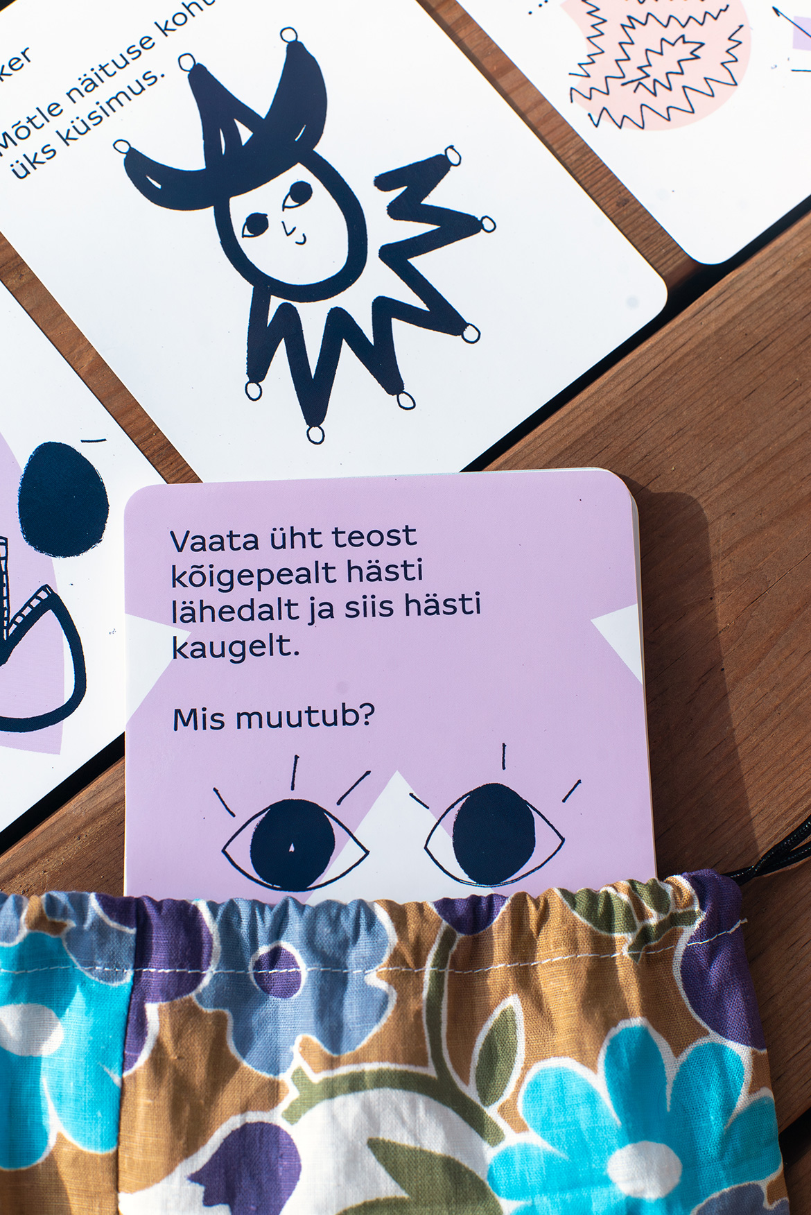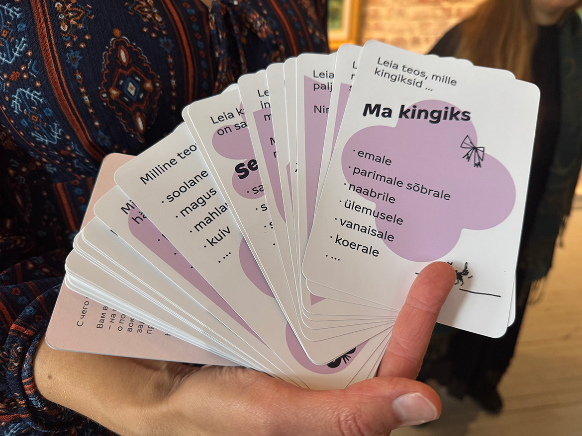 The aim of the Face to Face with Art (Silmitsi kunstiga) cards is to offer language learners and art enthusiasts an exciting and engaging opportunity to experience art, analyse it, while practising Estonian at a level that suits them. The deck contains 42 cards with questions and tasks that help the players delve deeper into works of art and develop their vocabulary, speaking skills, and grammar. The questions are divided into three language levels (A1–A2, B1, and B2). In addition, the deck contains joker cards that allow the players to come up with their own tasks.